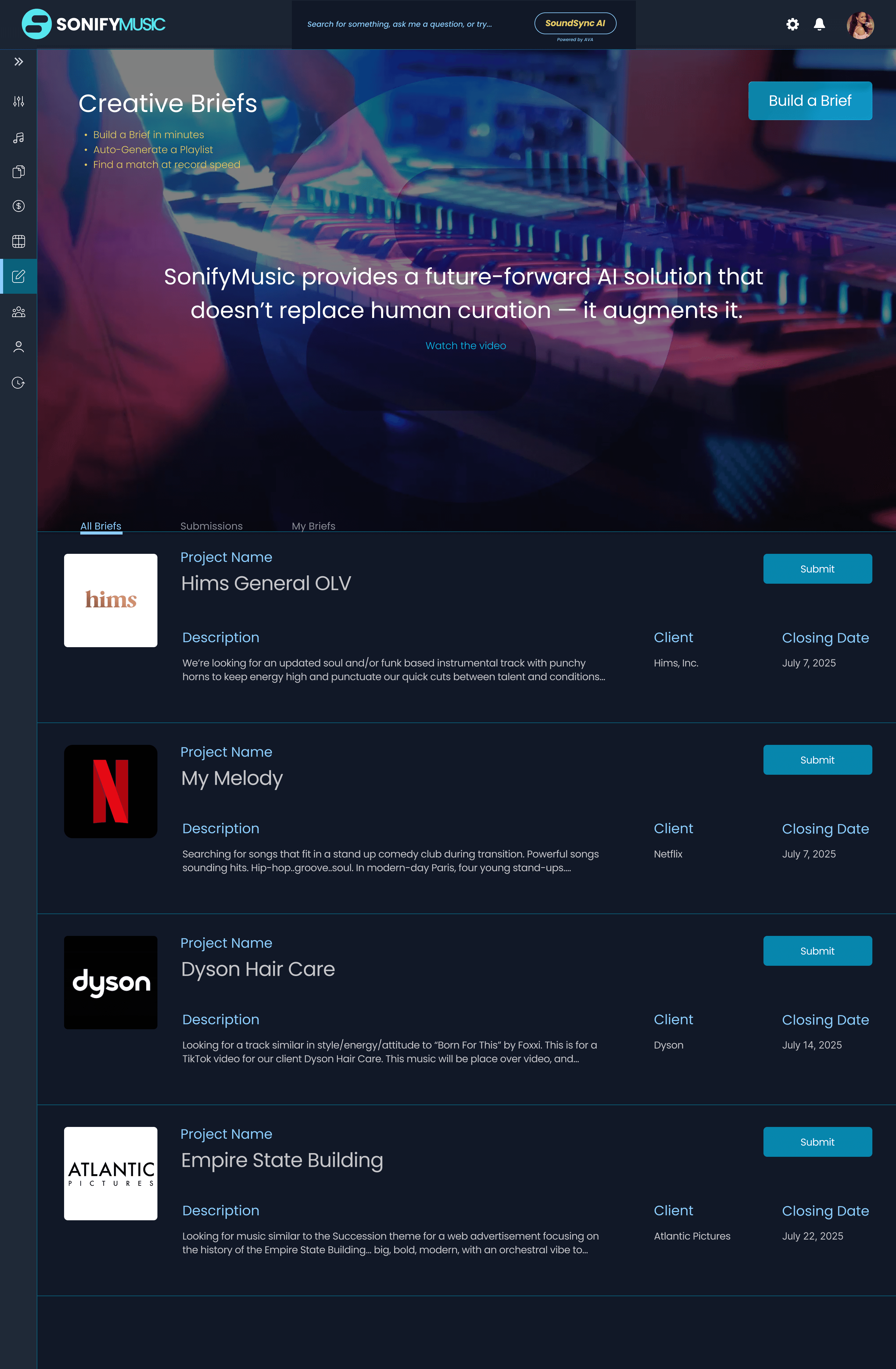 Once a brief is posted, Soundsync AI generates a curated set of matches using both audio analysis and structured metadata.